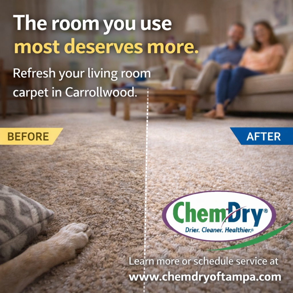 In Carrollwood, the living room carries the weight of daily life. It is where families gather, pets relax, and routines unfold. Over time, even without major spills, carpet begins to show subtle signs of wear. Fibers flatten. Traffic lanes slowly appear. The room may look fine at first glance, but it no longer feels as fresh as it once did.