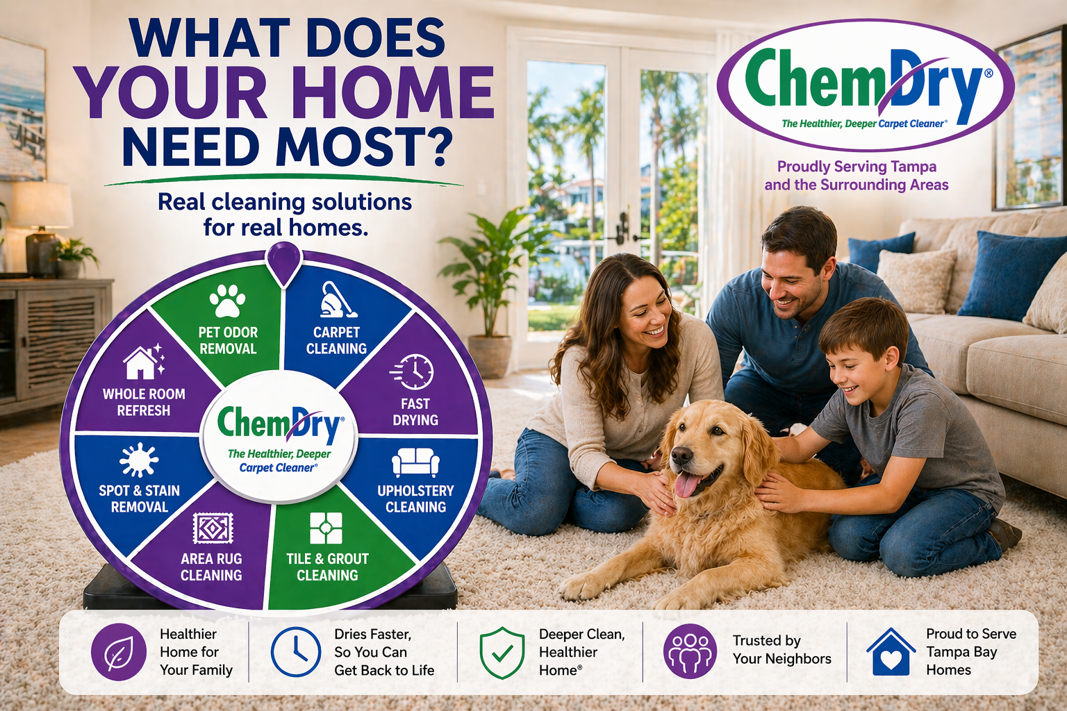 That is what makes this kind of Chem-Dry of Tampa message so effective. It does not assume every customer has the same problem. Instead, it speaks to the real cleaning concerns people deal with every day in Tampa Bay homes. The wheel in the image turns those common concerns into something simple and visual. It shows that whether the issue is odor, appearance, dry time, or the overall feel of the room, there is a solution.